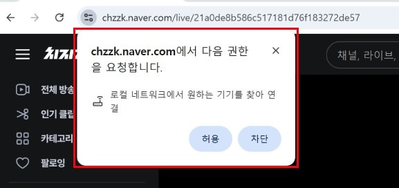 치지직 라이브 시청시 로컬 네트워크 연결을 차단하거나, 로컬 네트워크 연결을 허용하지 않은 상태에서 시간이 오래 지날 경우 라이브 시청이 불가능할 수 있습니다.